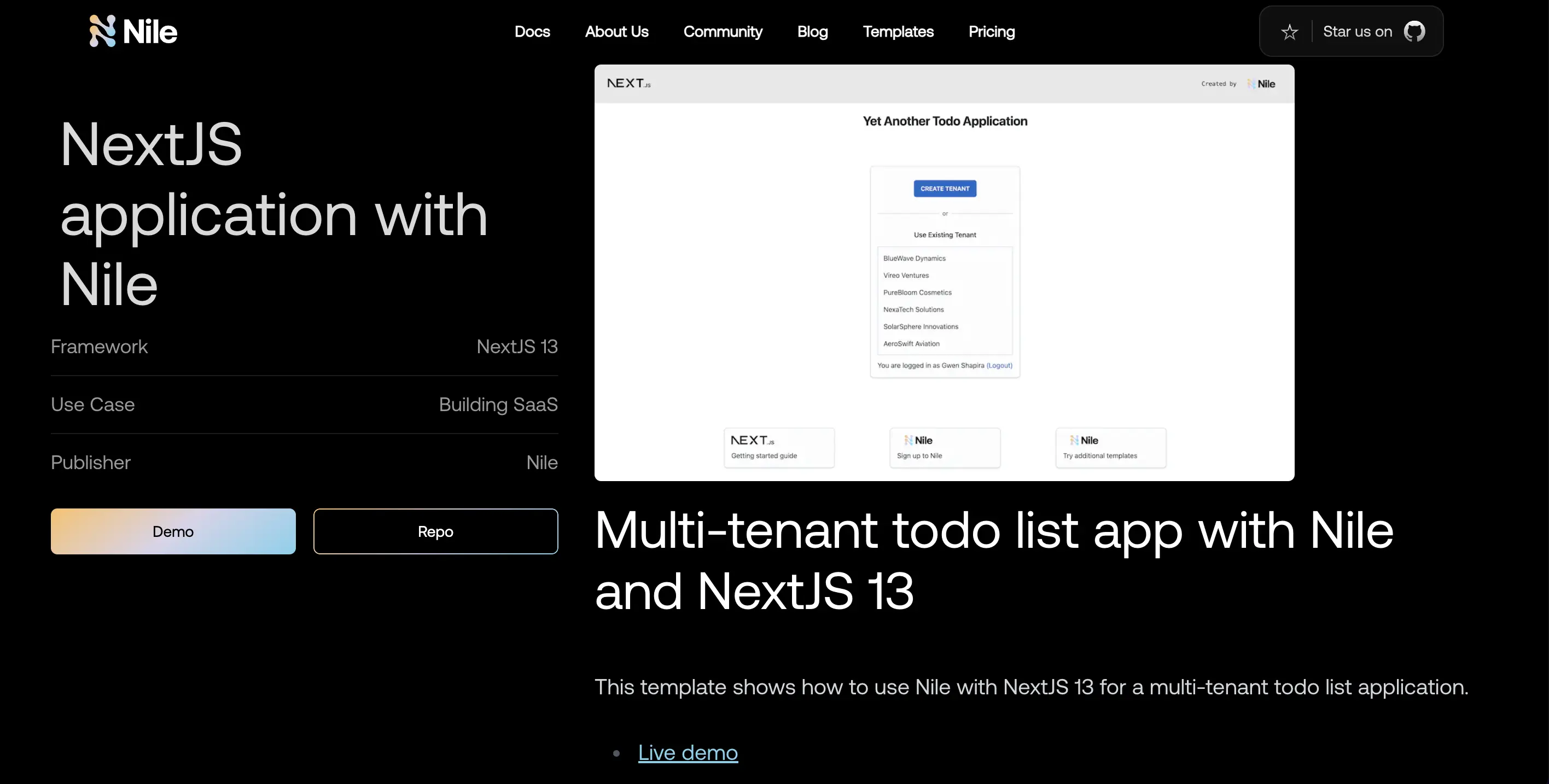We will provide a quick walkthrough on how to access and use Nile templates. To follow along, I recommend opening the templates landing page in another tab. On this page, you will find a list of templates that can assist you in getting started. We have plans to add more templates and showcase community contributions here continuously.