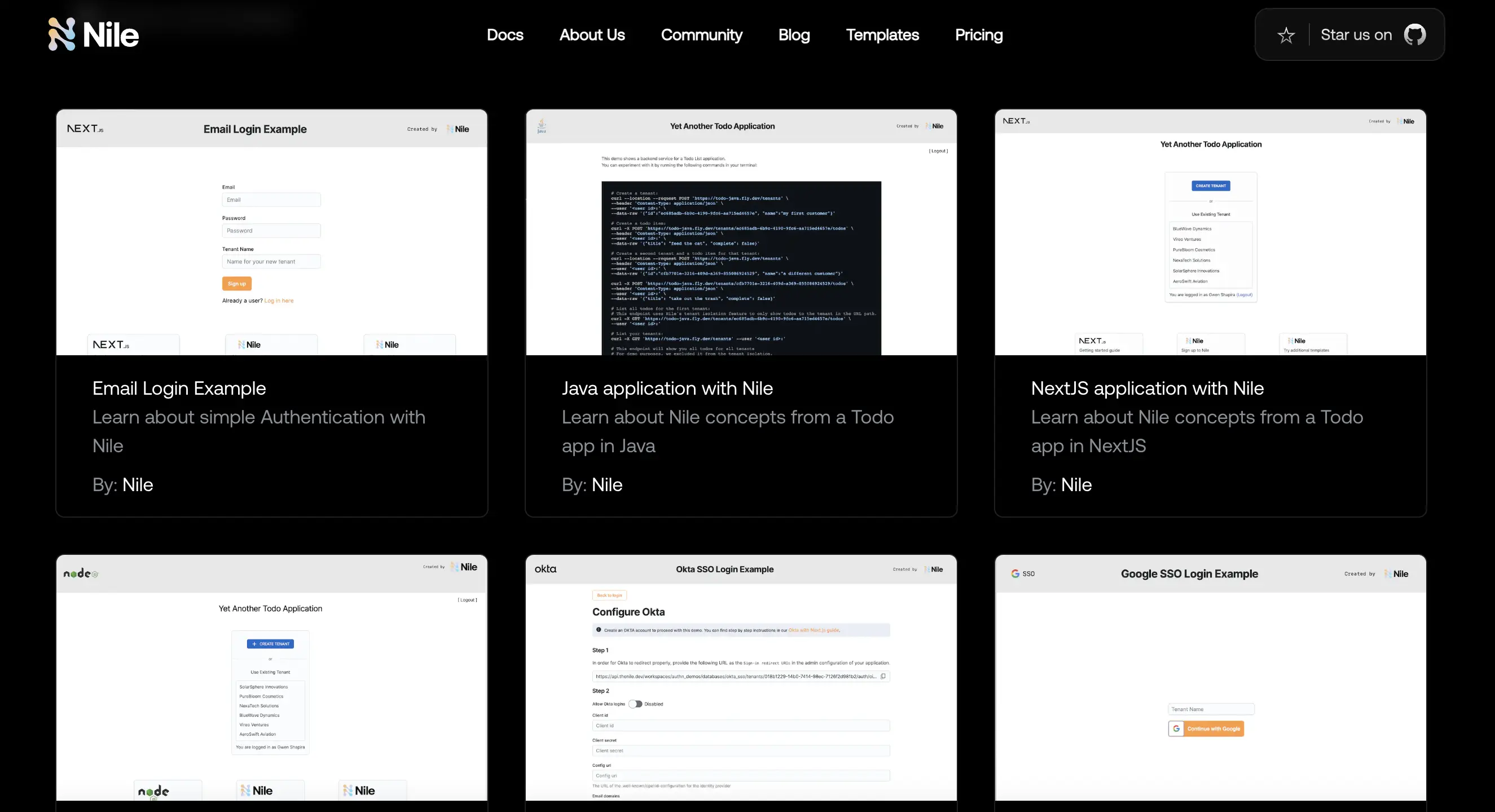 Nile templates are pre-built examples that simplify the process of starting with Nile's Postgres to create modern SaaS applications. These examples demonstrate how to build a basic multi-tenant application, achieve tenant isolation without additional permission logic, and add user authentication features such as basic email login, Google SSO, and enterprise login options like Okta. Setting up and running these examples locally should only take 5-10 minutes. We are excited to see developers build wonderful modern SaaS applications with these templates.