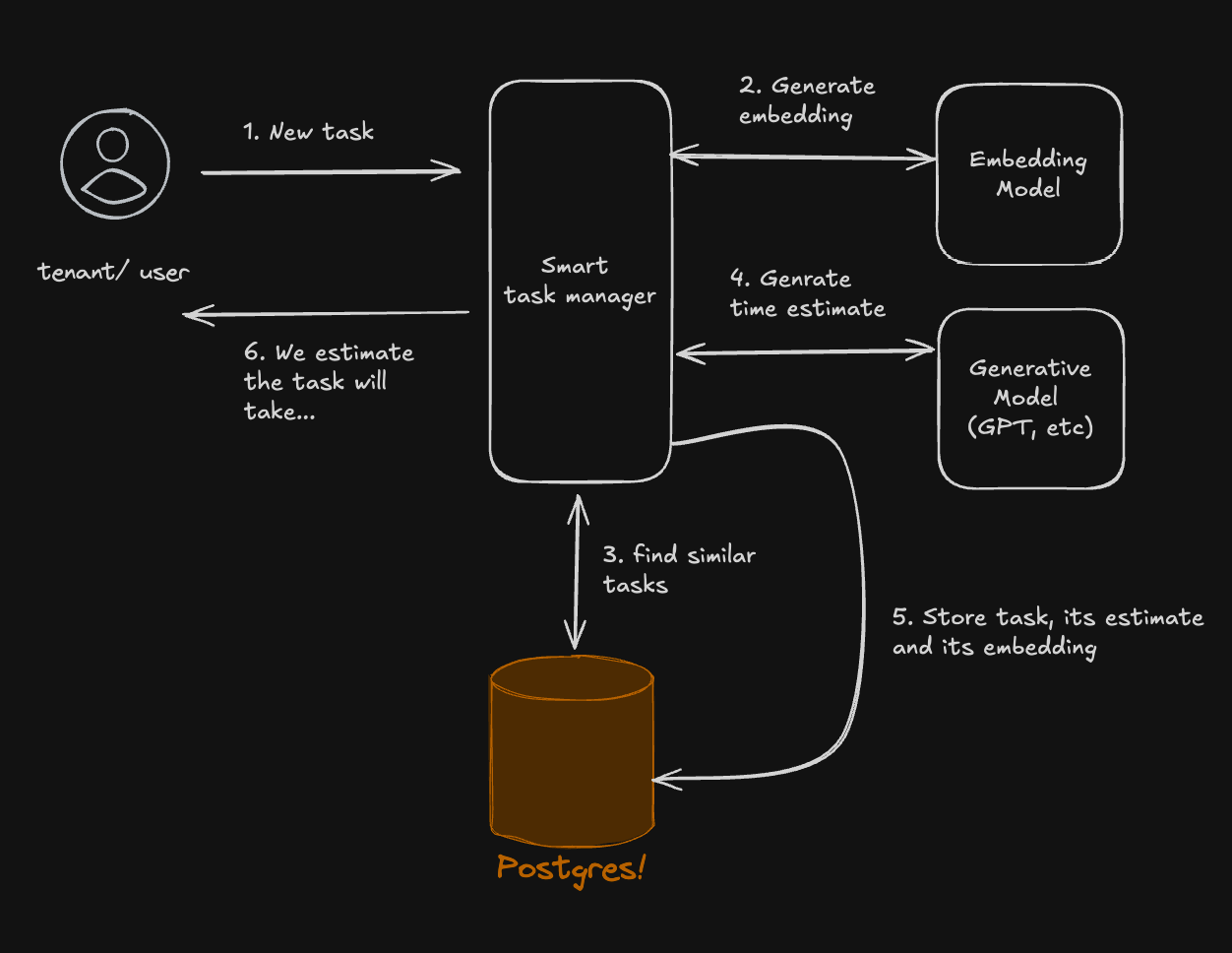 In all these examples, we are building a smart task manager that uses past tasks, their time estimates and an LLM to estimate how long new tasks will take. To implement this, we insert tasks with embeddings and later search for similar tasks based on their embeddings. Naturally, we don't want to mix tasks between tenants.