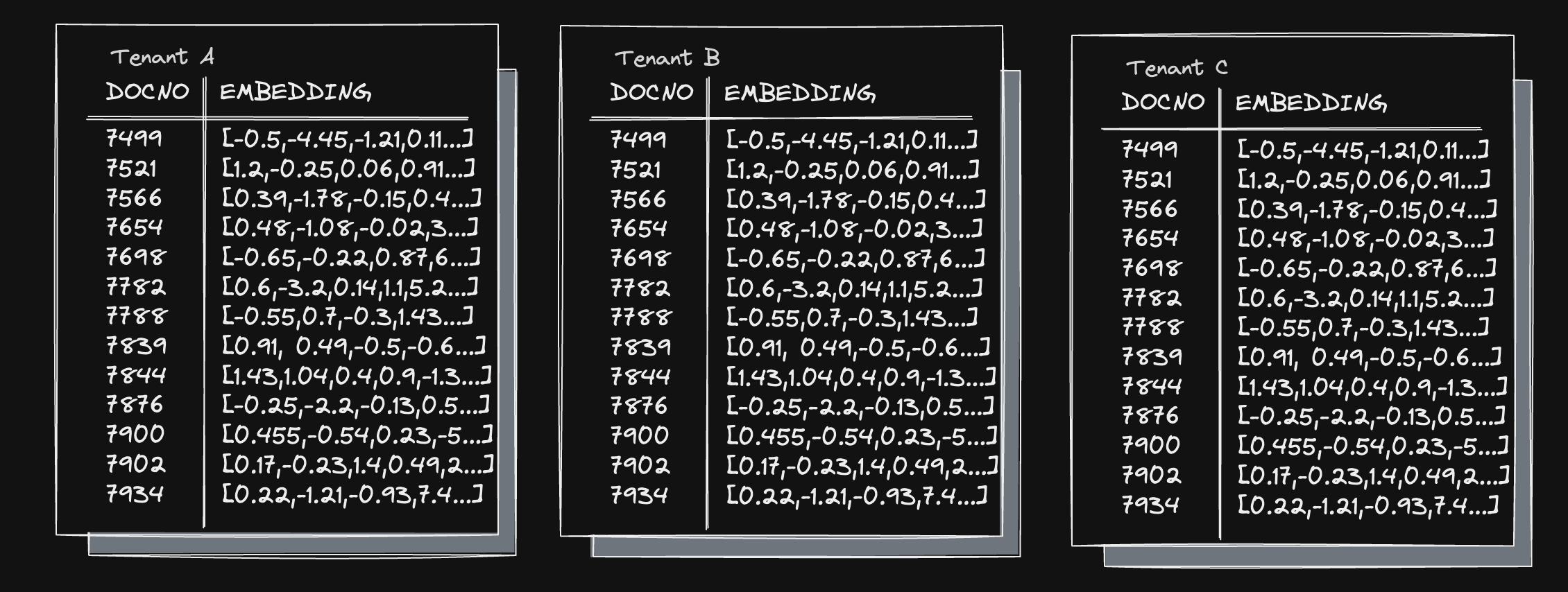 In addition to benefits from a user trust perspective, multi-tenant RAG also has performance benefits. RAG architectures have two high-latency steps: Retrieving vectors and LLM inference. Multi-tenant RAG makes vector storage and retrieval significantly more efficient: Searching vectors for a single customer is many orders of magnitude faster and more efficient than searching through all customers and then filtering the result. In many cases the number of vectors per customer is small enough that if you limit search to a specific customer, you can perform exact nearest neighbor search in a reasonable time, which means you benefit from perfect recall. As opposed to approximate nearest neighbor search, using indexes such as HNSW, where you trade-off resources, latency and recall.