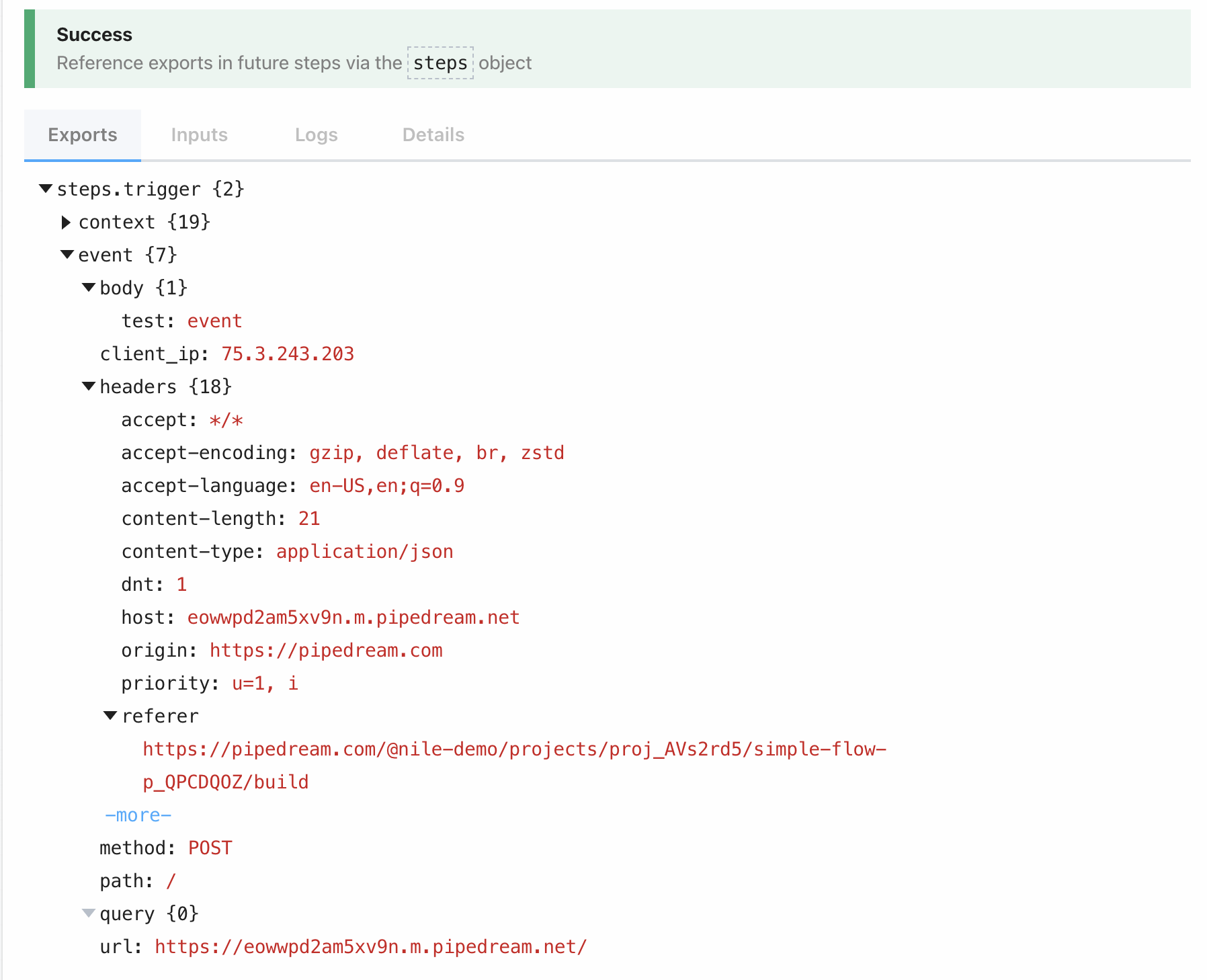 - Always Preserve Tenant Context: Make sure you're passing tenant IDs through your entire workflow, especially when executing queries againt tenant data in Nile. Pipedream makes this easy by exporting event variables in each step.