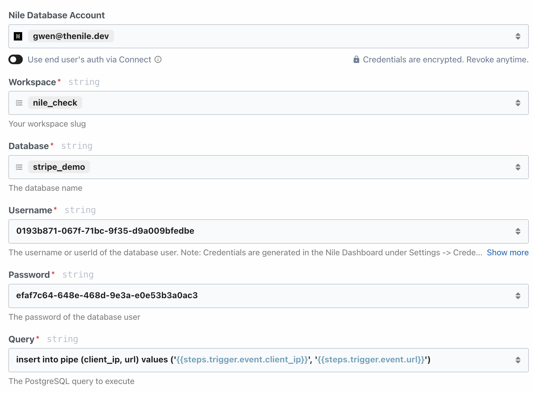 Once you gave Pipedream access to Nile, you'll be able to pick your workspace and database from the dropdown menus. Then, provide username and password credentials to the database you picked.