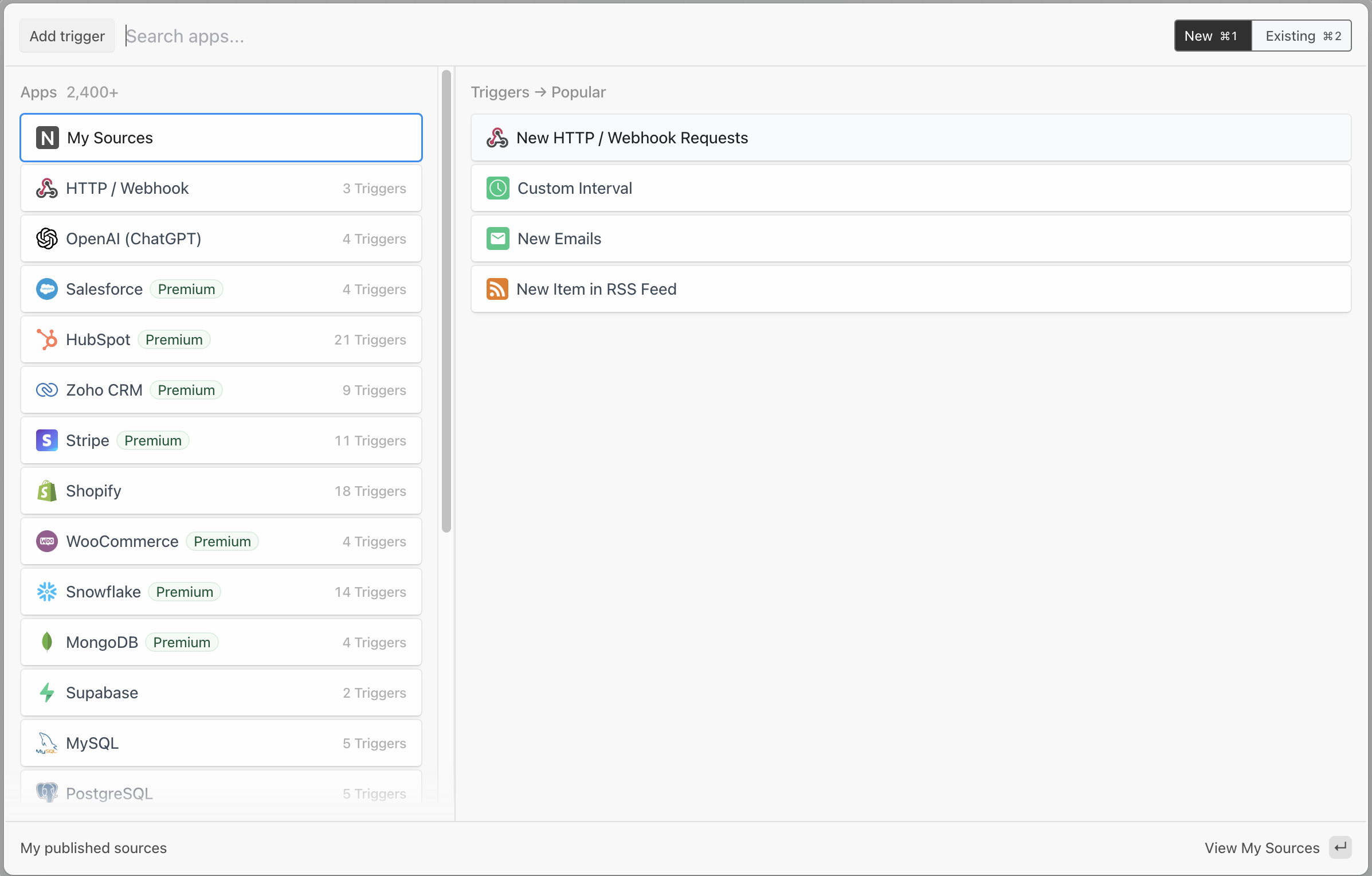 In Pipedream, create a workspace or choose an existing one. Then click on new to create a new workflow.