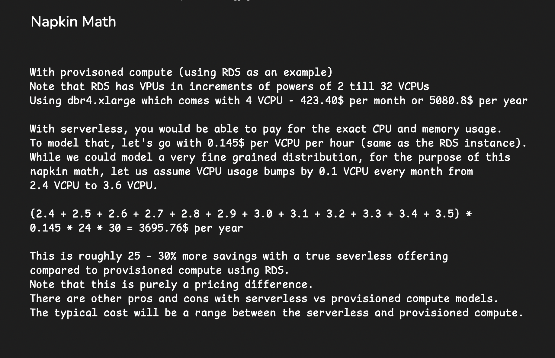 A rough napkin math to compare RDS for a 4 VCPU instance vs a serverless option where you pay for utilization shows that the serverless option can be 25-30% lower cost. The gap between the cost for serverless vs provisioned compute shows the range of pricing you could possibly have between the two options. While serverless pricing is attractive, a common problem is that it could suddenly spike the billing if usage drastically increased. This can be avoided by providing price cap and throttling usage when the bill goes above the limit set.