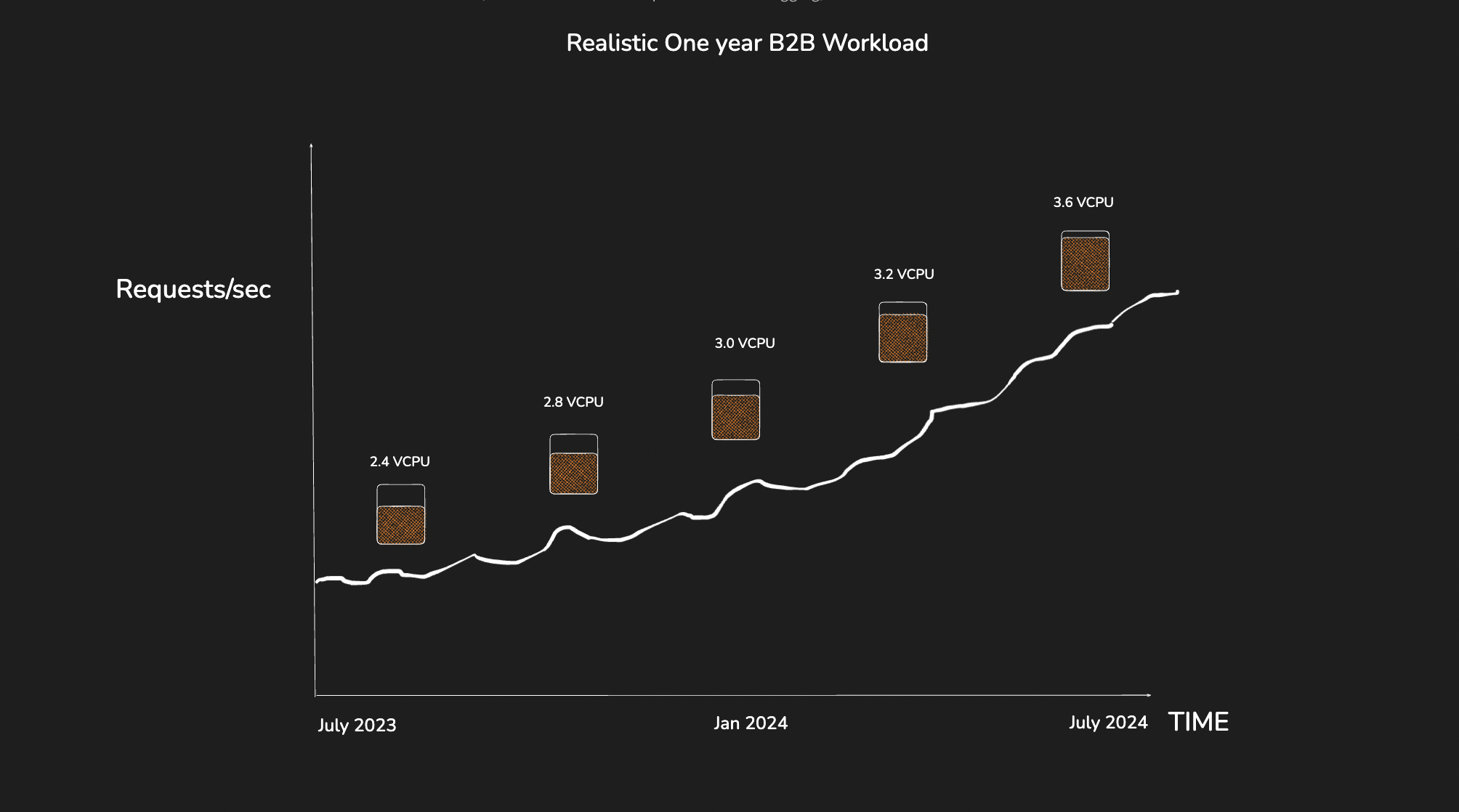 A typical B2B workload is mostly predictable but continues to grow at a steady rate with some step function growth from time to time due to product changes or new distribution channels. The compute utilization will continue to increase gradually over the period of growth. For a compute requirement shown below, you would typically need to opt for a 4 VCPU instance on RDS when you hit the 2 VCPU limit.
