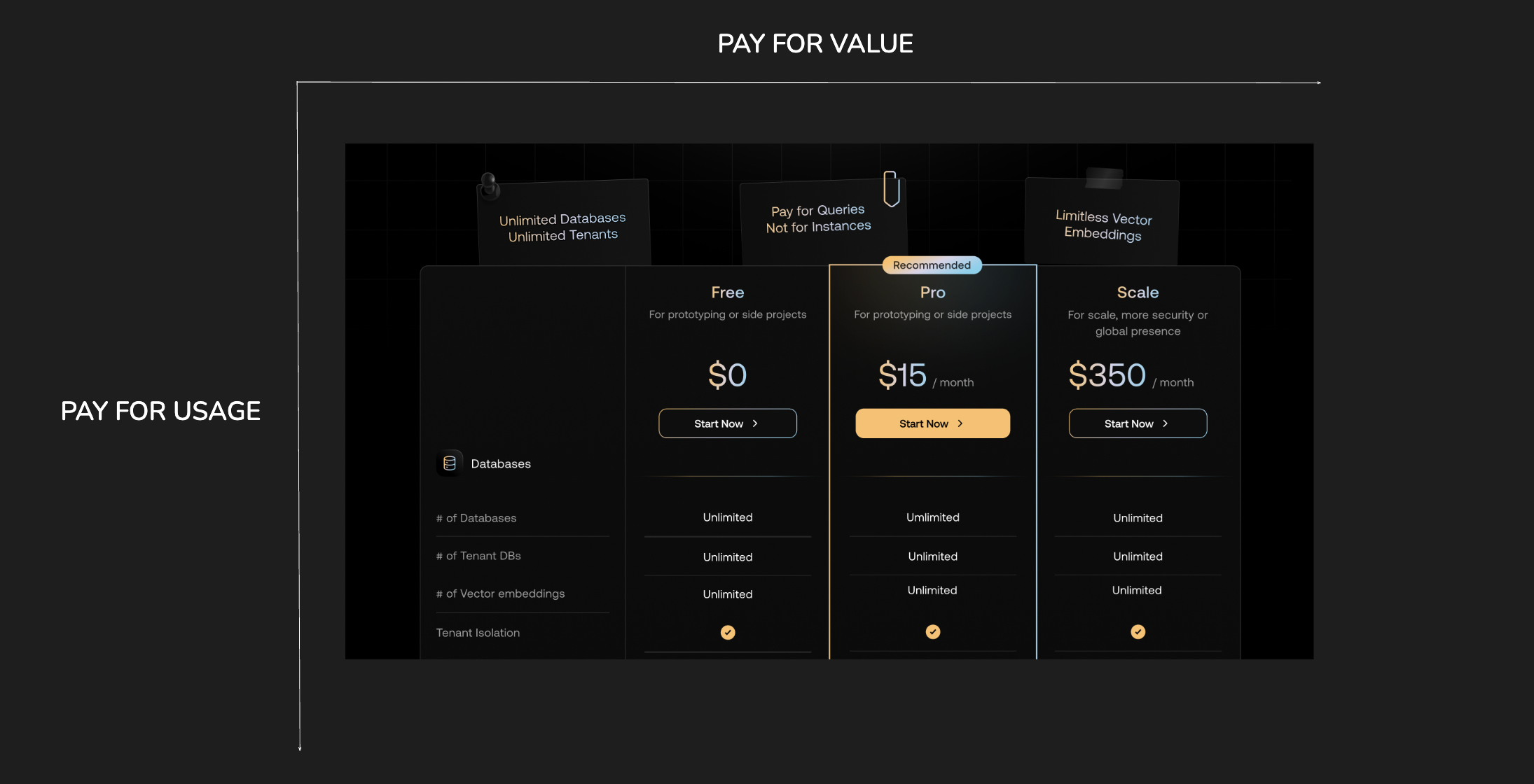 We want pricing to be transparent and fair. We also wanted it to be 10x better than anything out there, given the future of AI, which is going to 100x the number of databases. At the same time, pricing is complex, and these principles are based on how we think about pricing today. We will continue to iterate on pricing and be transparent and honest about it. We have three core values on which our pricing has been built.