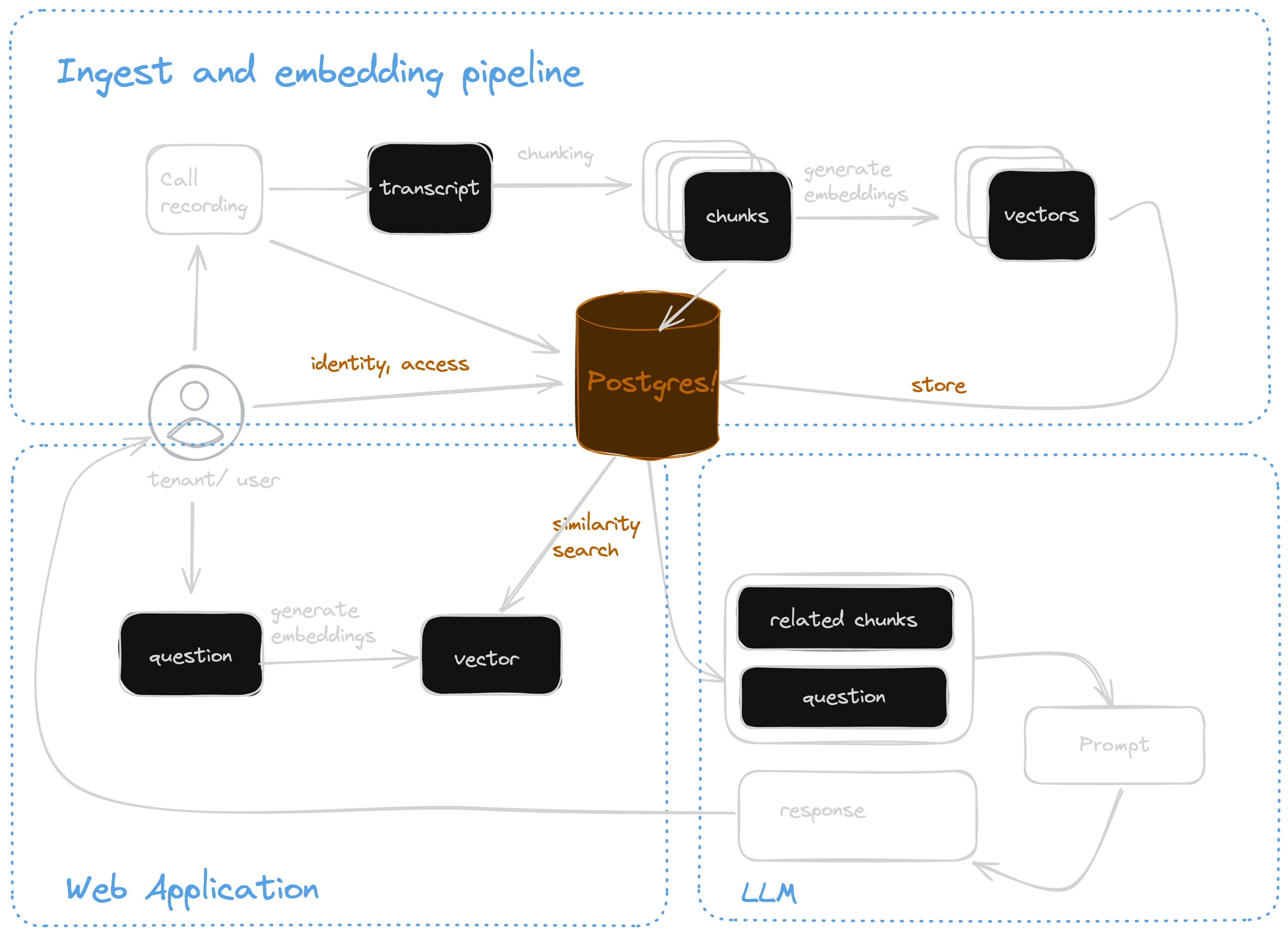 - Ingest and embedding pipeline for processing recordings of sales calls and storing the chunks and embeddings in the database. This can happen continuously offline.