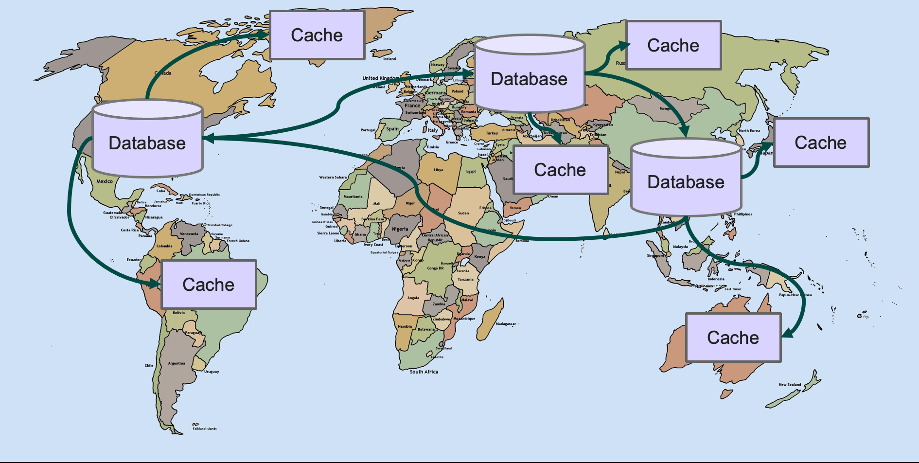 Typically this global distribution translates to having relational databases in 2-5 main datacenters, with selective replication between them. In addition to DBs in main datacenters, it is common to have a much larger distribution of caches that speed up performance of read operations.